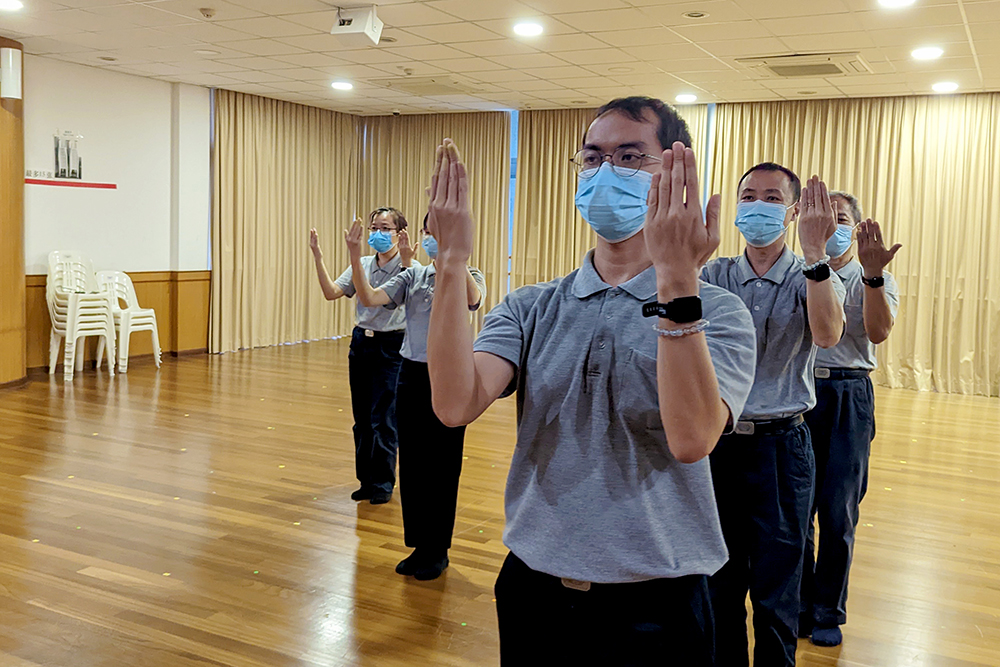位于岛国北部的中医义诊中心职工,就联同两位西医部职工,趁午休空档练习;而两所幼教中心职工是趁每周五下班后的时段,紧锣密鼓排练。静思堂职工则是每周星期一、三、五,于午休的半小时空档练习。对很多参与过经藏演绎的职工来说,像今天这般反复微调姿势和表情,都是入经藏必经的“化城”。