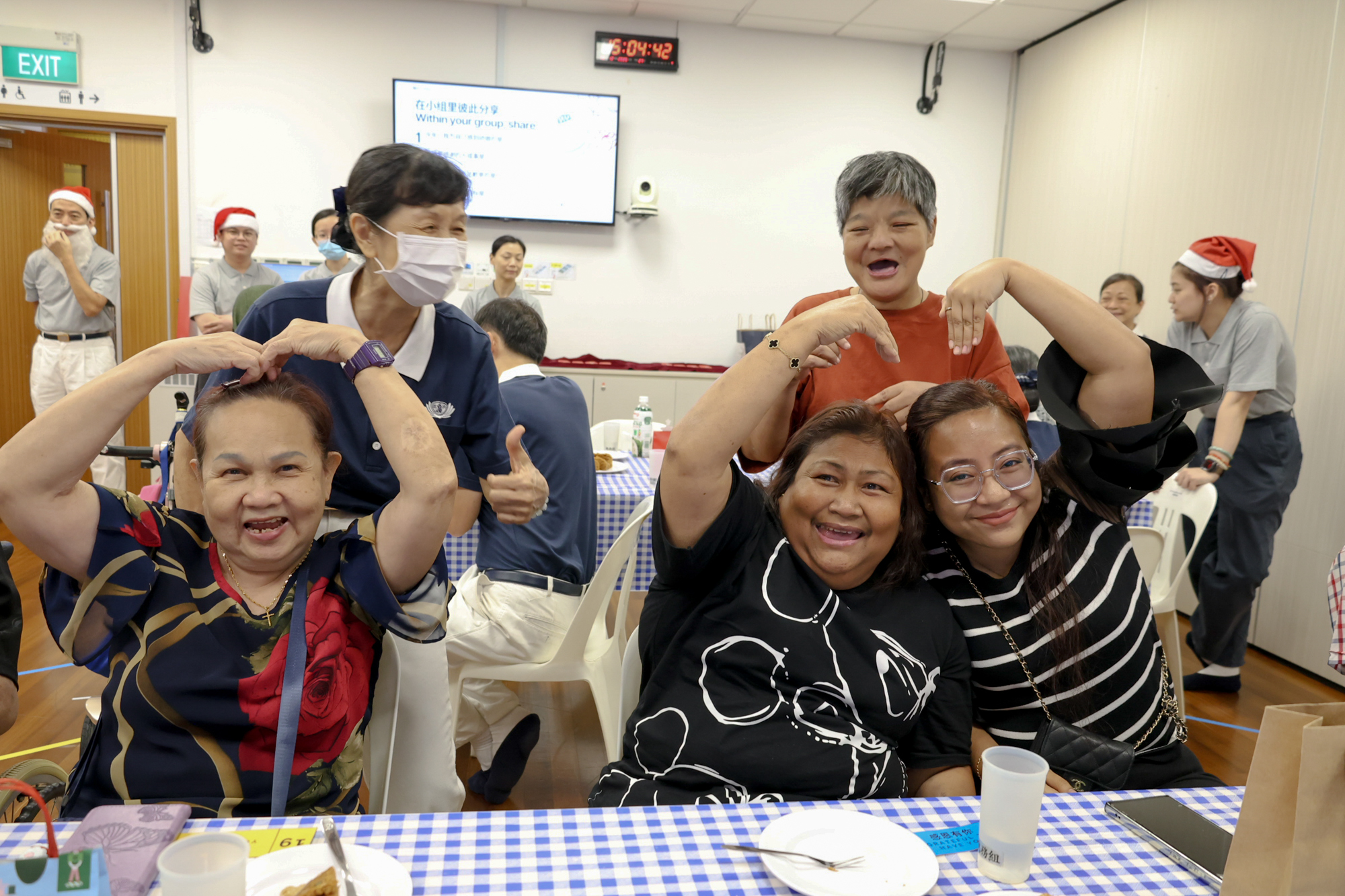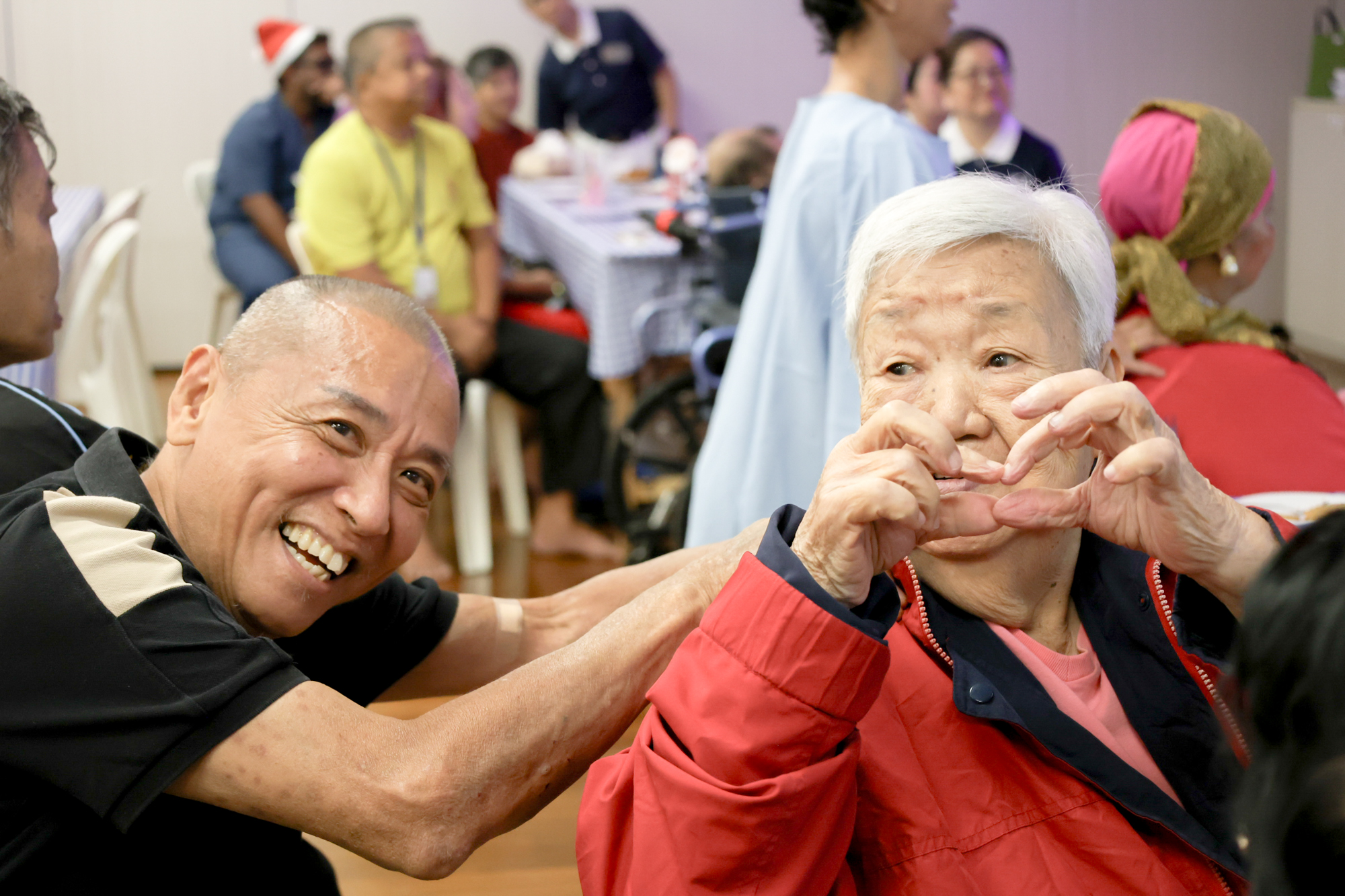 90岁的Mdm Hong(右)双手比心表达感恩。